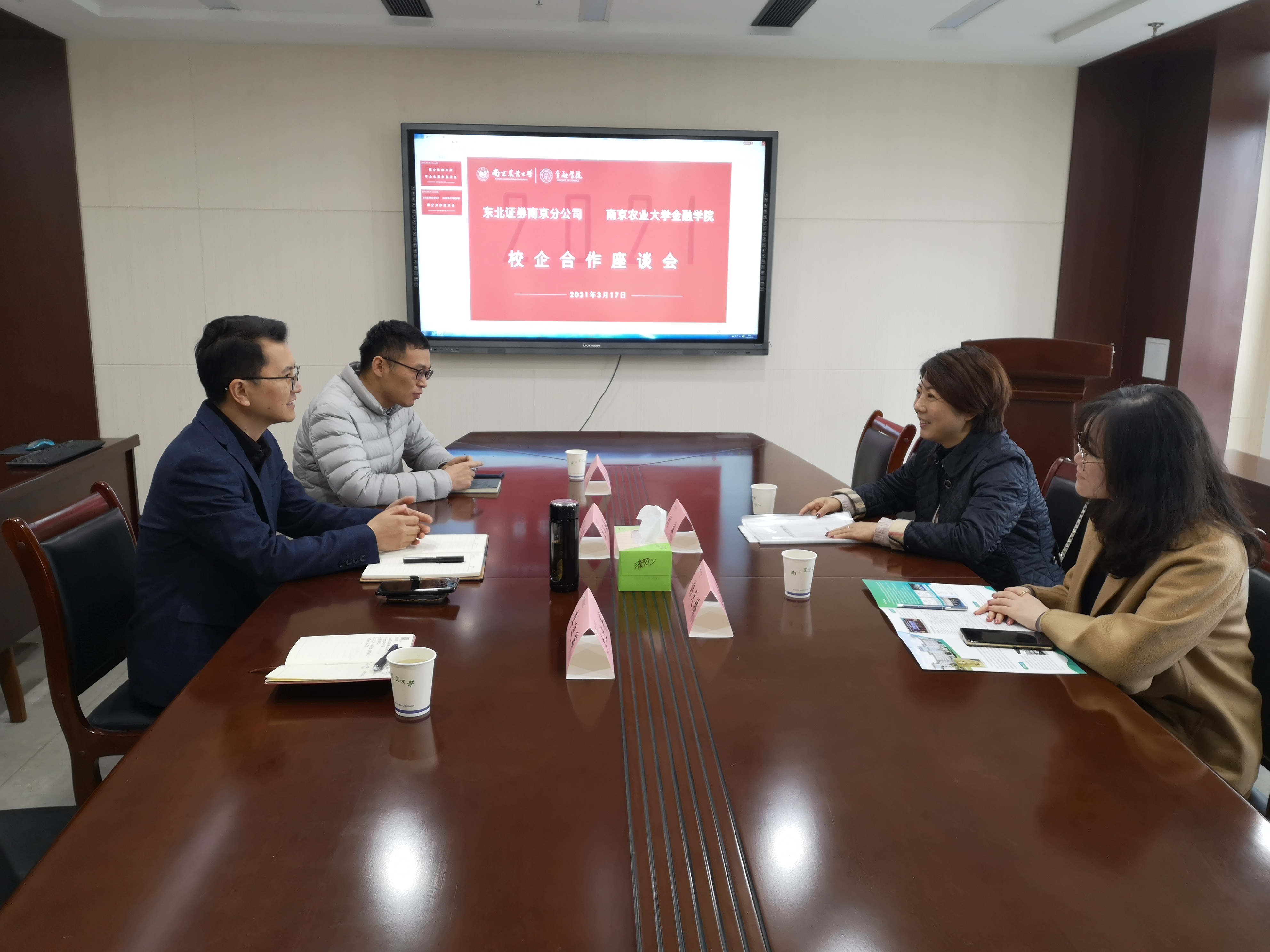 近日,Av大平台 与兴业证券南京分公司、东北证券南京分公司就共促毕业生就业工作开展座谈交流。兴业证券南京分公司总经理江鹏飞、人力相关负责人朱倩,东北证券南京分公司副总经理刘华、财富总监韩天娇等到访Av大平台 ,Av大平台 党委副书记李日葵、Av大平台 辅导员陆佳俊、李迎军参加座谈。