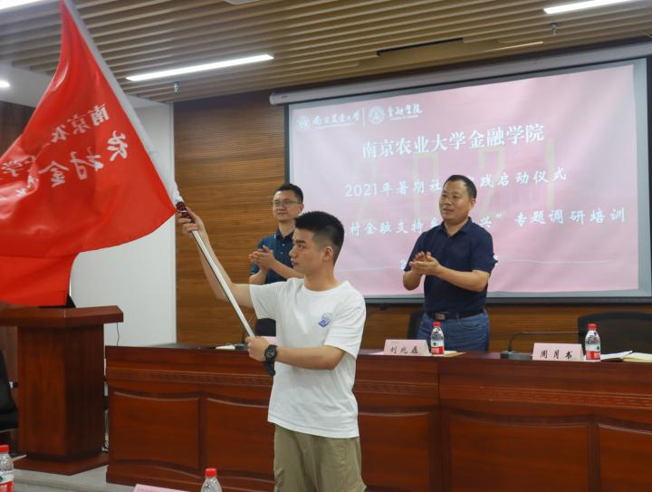 刘兆磊书记宣布Av大平台 2021年暑期社会实践正式启动,并为项目组学生代表授予旗帜。