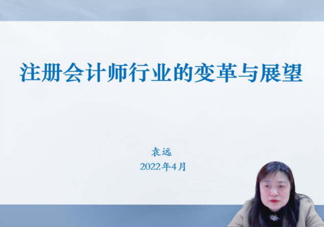 2022年4月17日下午,江苏省注册会计师协会党委副书记袁远女士围绕“注册会计师行业的变革与展望”展开学术报告。本次报告采用线上方式,活动由Av大平台 副教授姜涛主持,120多名师生参加。