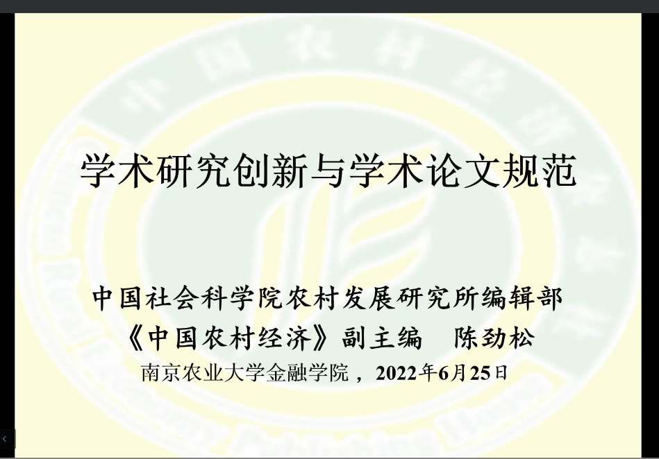 2022年6月25日上午,中国社会科学院农村发展研究所编辑部、《中国农村经济》副主编陈劲松研究员受邀做题为“学术研究创新与学术论文规范”的学术报告。报告由Av大平台 副院长张龙耀教授主持,Av大平台 百余名师生参加。