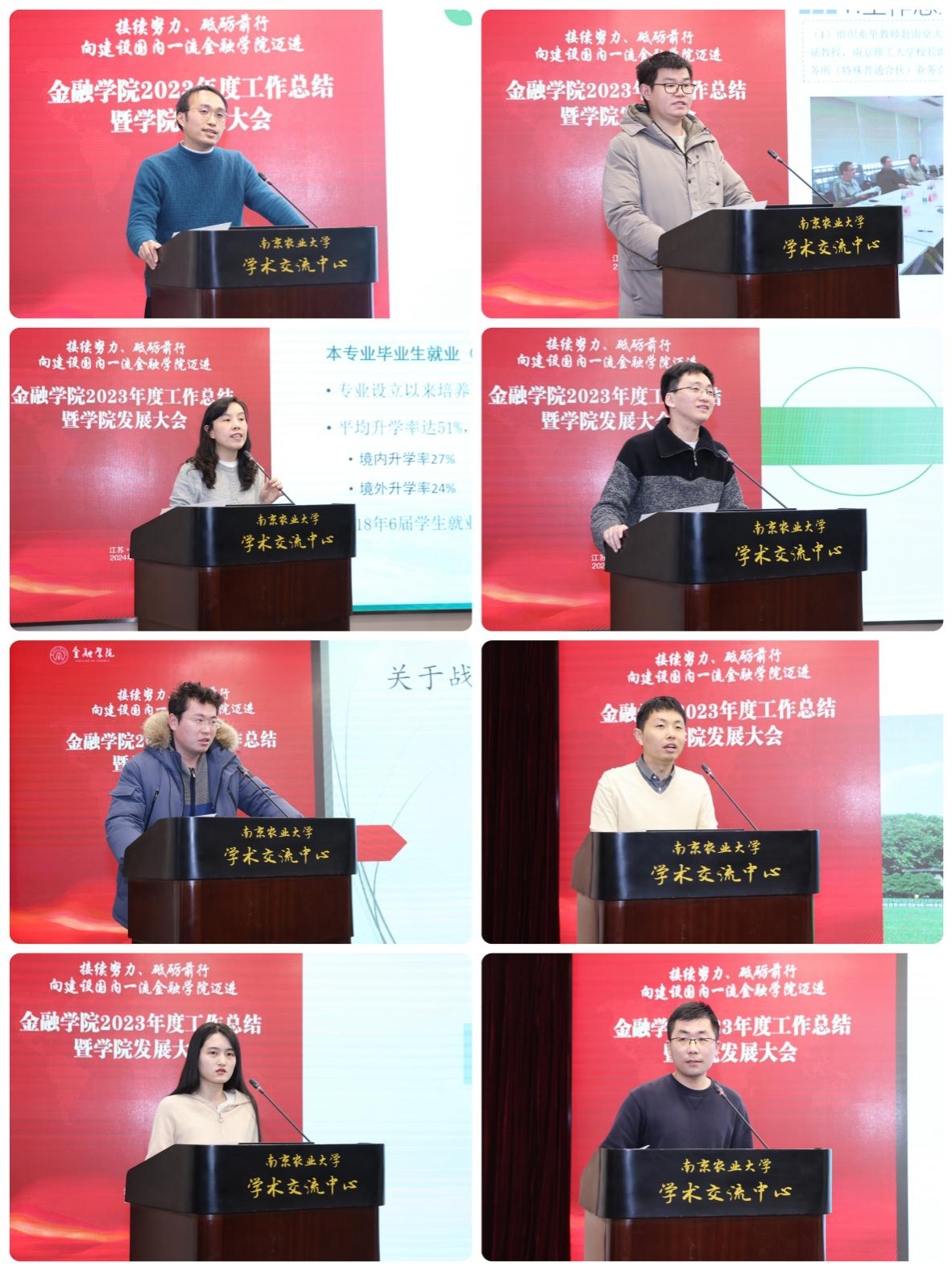 金融系系主任彭澎、会计系系主任汤晓建、投资系系主任黄惠春汇报了2023年度工作情况和专业建设情况。盛天翔、陈文、王超、吴雅倩、亓浩等青年教师代表作了科研进展交流。