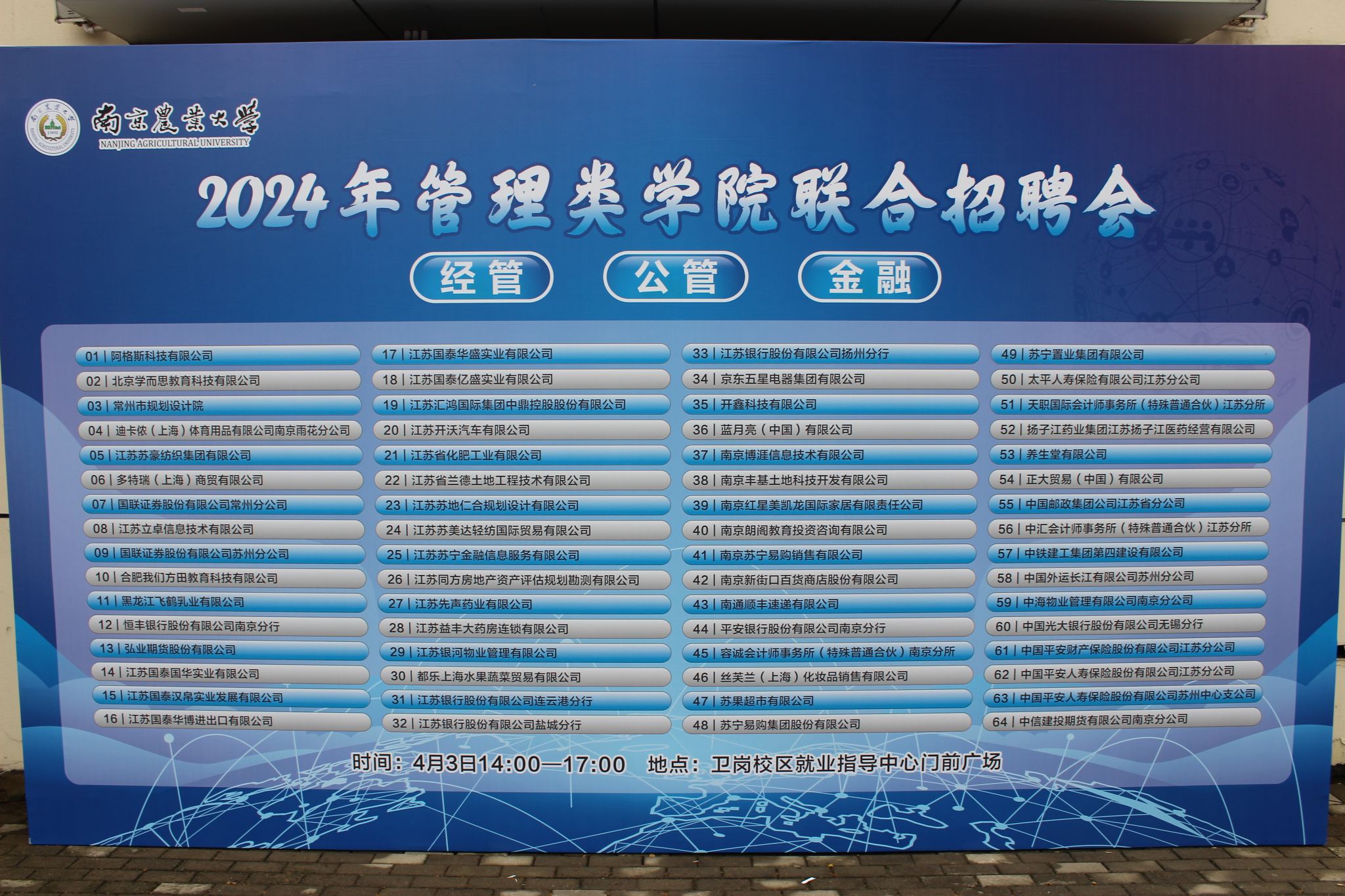 2024年4月3日,Av大平台 2024年管理类学院联合招聘会在卫岗校区校友山广场顺利举办。此次招聘会由Av大平台 与经济管理学院、公共管理学院联合举办。
