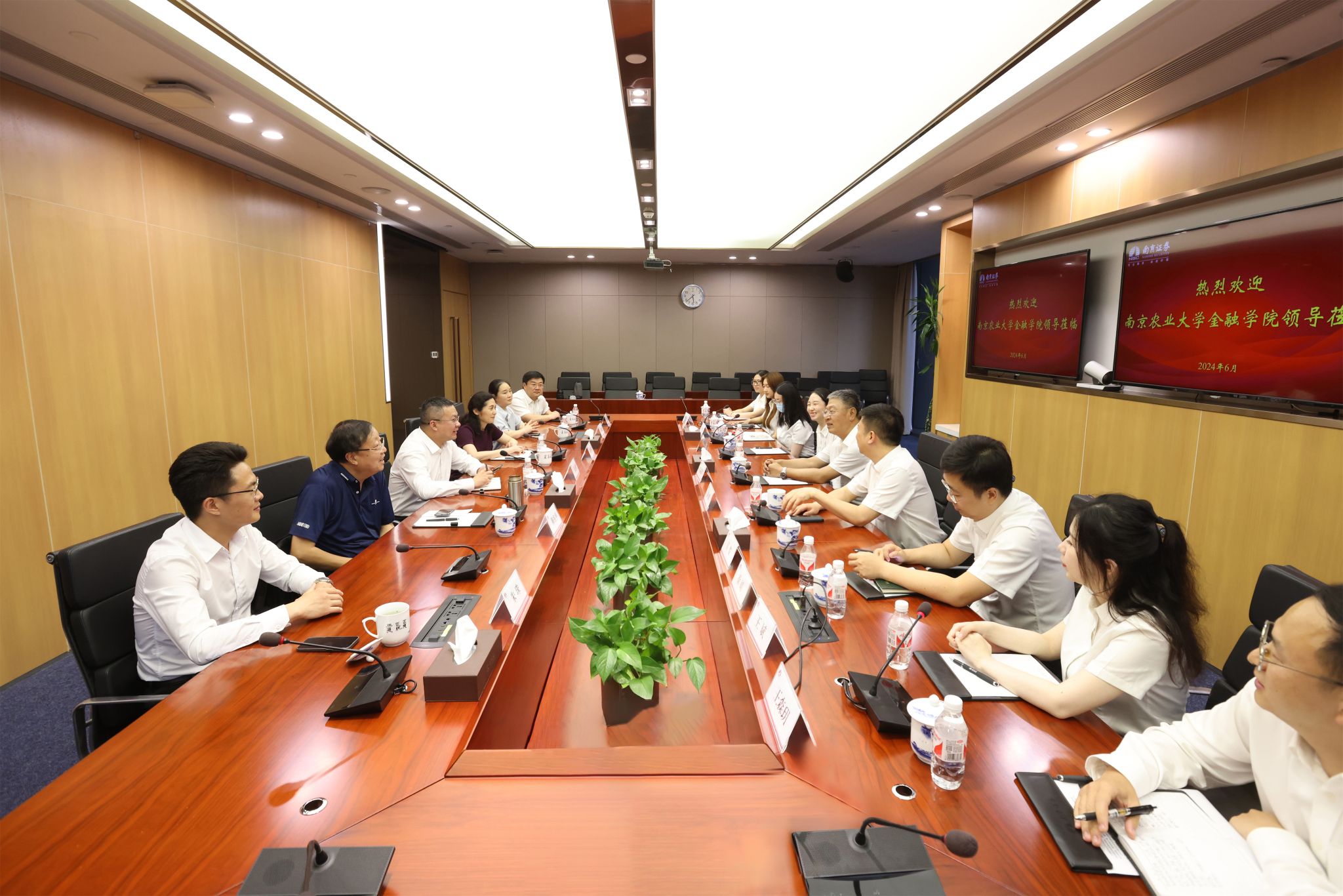 6月19日下午,Av大平台 院长张龙耀、党委副书记朱珠、Av大平台 教授陈东平、周月书等一行前往南京证券股份有限公司开展访企拓岗活动。南京证券党委书记、董事长李剑锋,党委副书记、监事会主席秦雁,人力资源部总经理莫俊,财富管理部总经理李东明等出席。