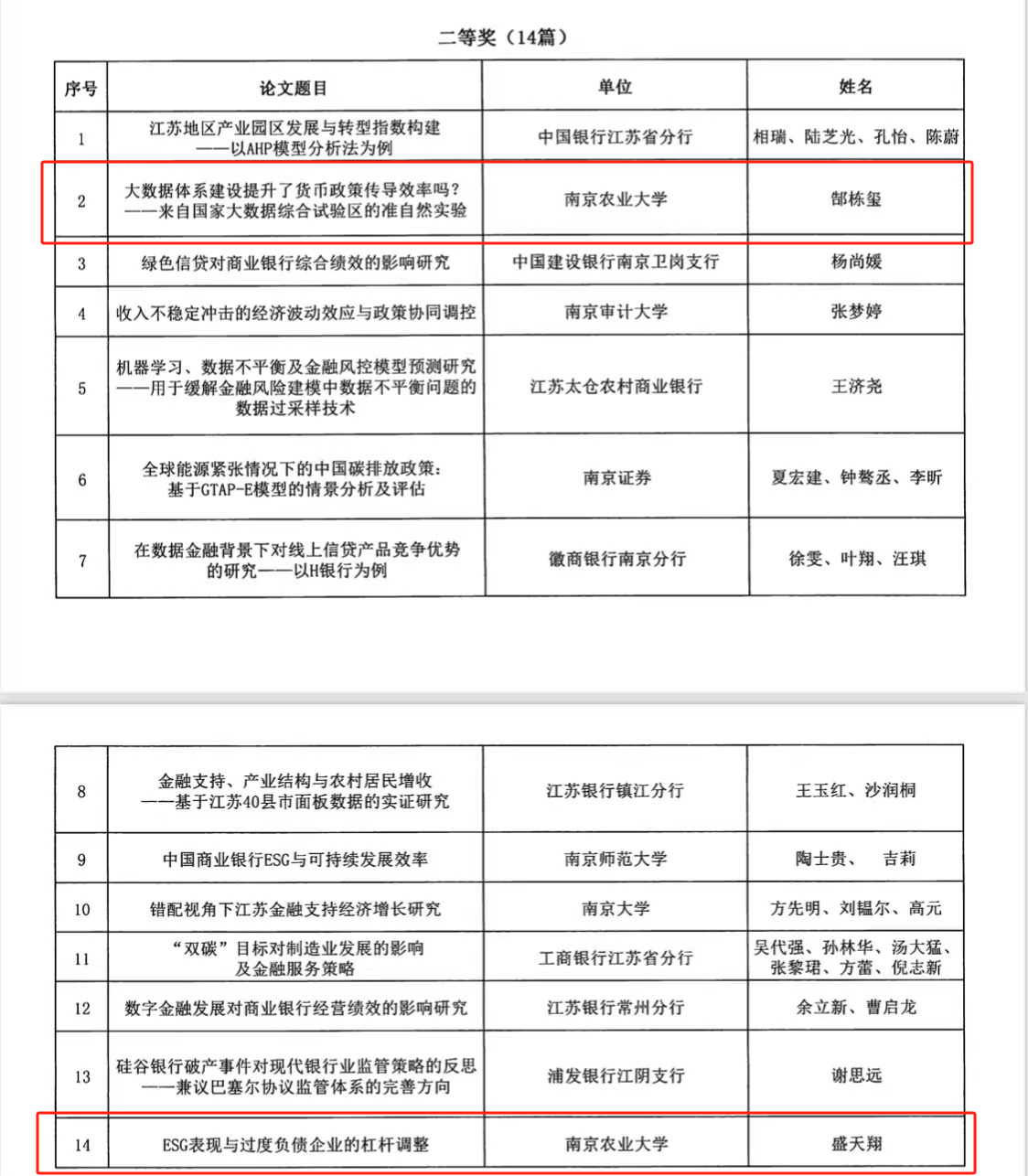 近日,江苏省金融学会发布了《江苏省金融学会关于第二十六届金融理论与实务征文评选结果的通报》。此次征文评选共上报论文90篇,经有关专家学者匿名评审,共评出一等奖9篇、二等奖14篇、三等奖23篇、表彰奖9篇。Av大平台教师郜栋玺、盛天翔获二等奖。