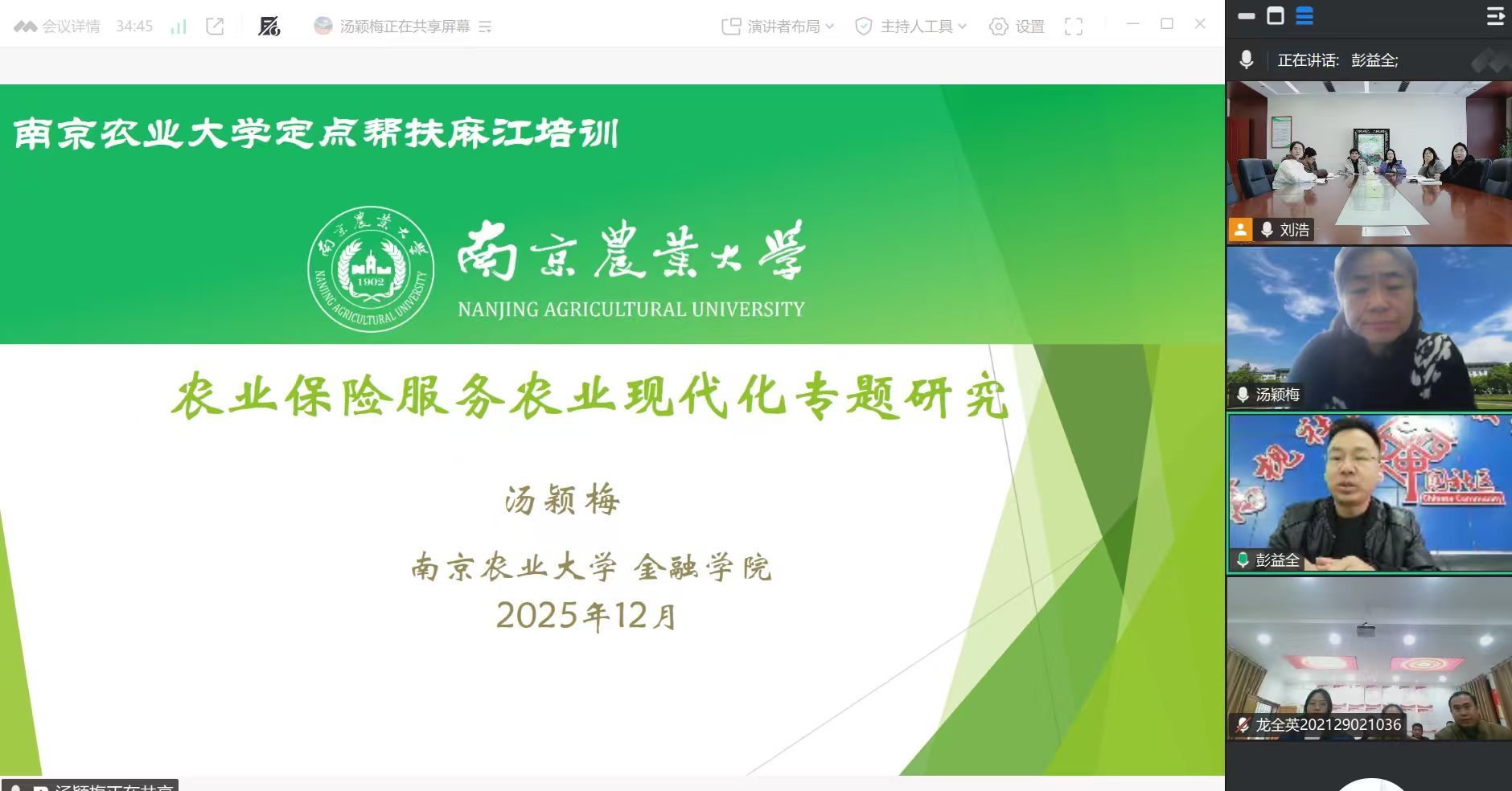 2025年12月3日上午,Av大平台 2025年定点帮扶麻江培训会议在Av大平台 1202会议室召开。本次培训采取线上形式,邀请Av大平台 汤颖梅教授作《农业保险服务农业现代化专题研究》培训。麻江县贤昌镇高枧村驻村第一书记彭益全、龙山镇河坝村党支部书记龙全成、Av大平台 副院长张娆、办公室秘书朱雅兰以及麻江县龙山镇河坝村农业企业经营大户、农户等41人参加了培训会议。会议由彭益全和张娆主持。