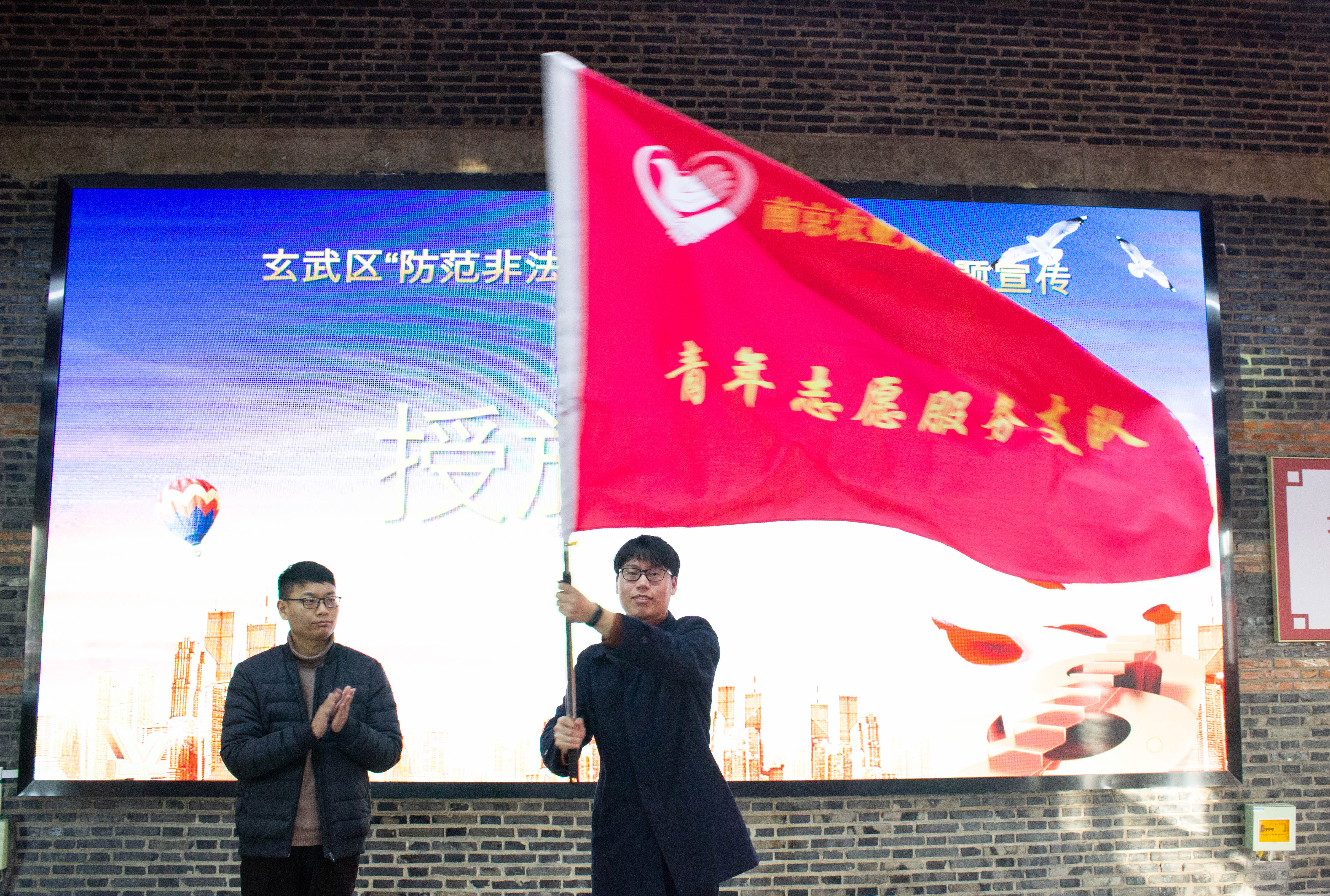 青年志愿服务工作负责人章焱为Av大平台 志愿服务团队授旗。