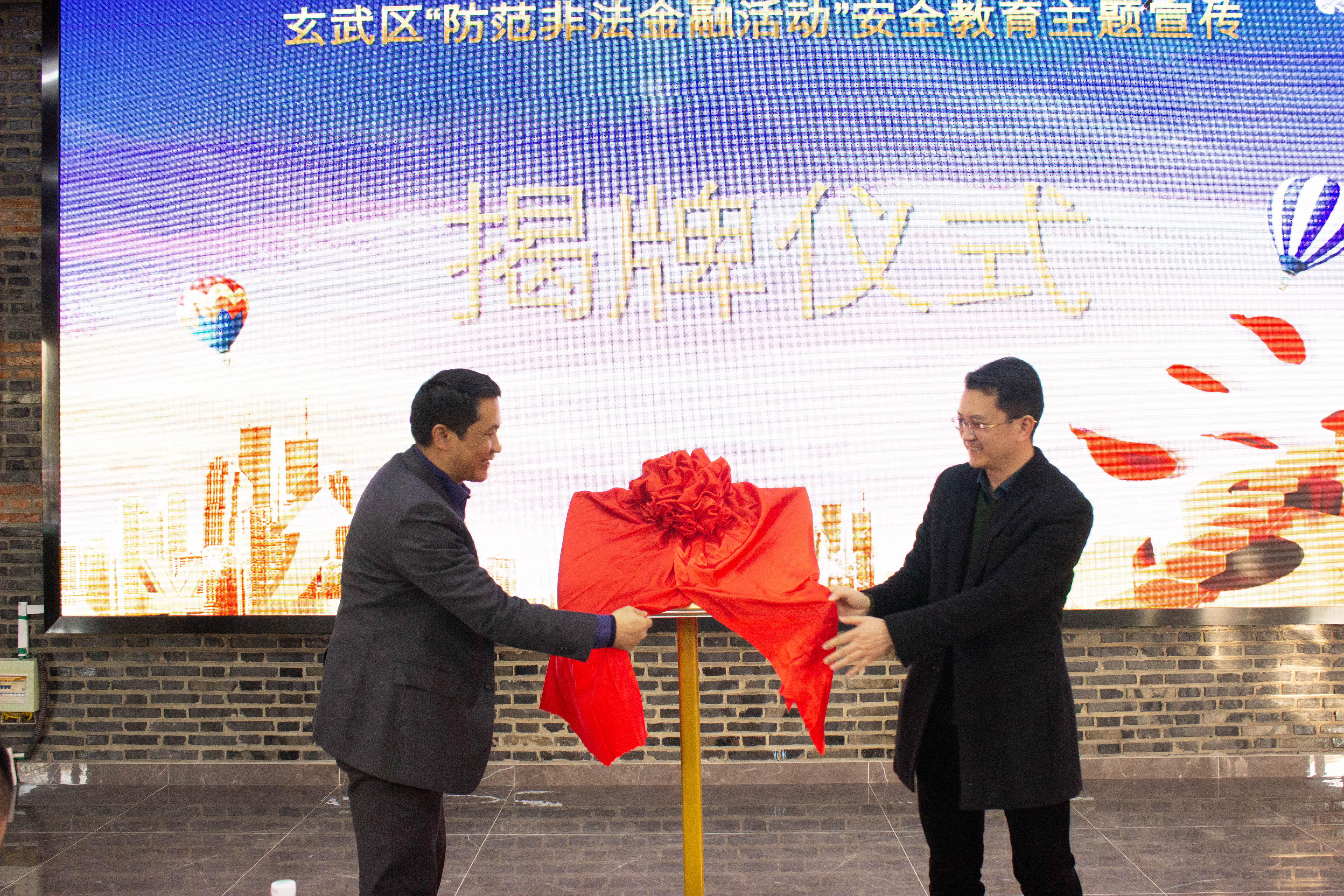 12月17日下午,Av大平台 与玄武区地方金融监督管理局、玄武区团区委、玄武区人民政府孝陵卫街道办事处、中国银行南京玄武支行,在T80科技文化国际社区联合开展玄武区“防范非法金融活动”安全教育主题宣传活动暨校地志愿服务结对共建仪式。南京市玄武区地方金融监督管理局副局长周光、玄武区人民政府孝陵卫街道办事处副主任徐丹、Av大平台 党委副书记李日葵、Av大平台 团委书记陆佳俊、中国银行南京玄武支行副行长马飞、中国银行南京玄武支行副行长吴天瑜和共青团玄武区委青年志愿服务工作负责人章焱出席了此次活动。