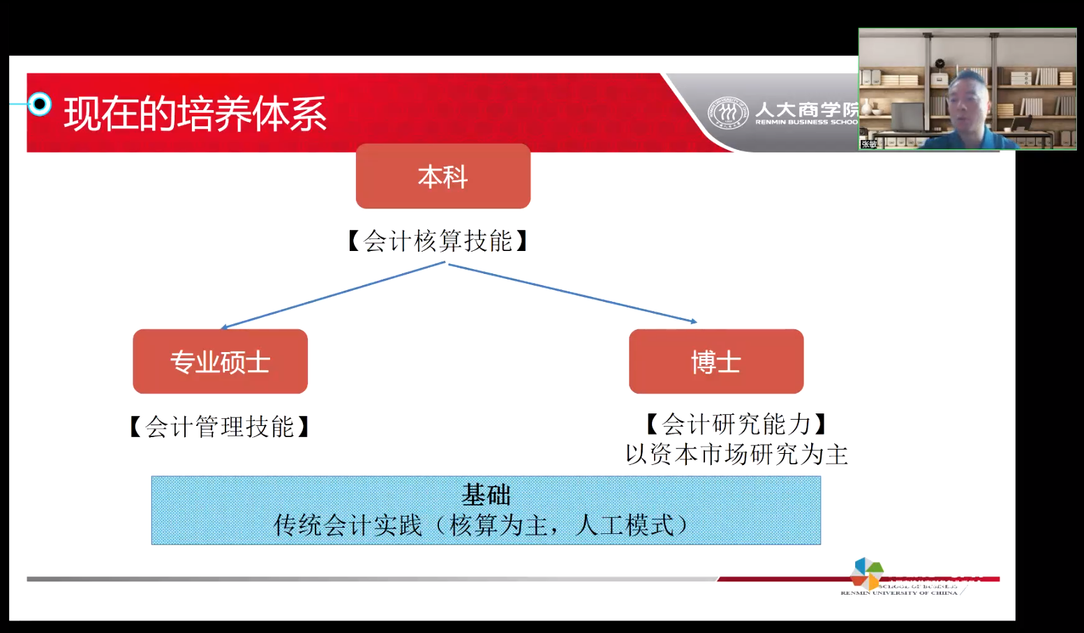 张敏教授以《关于中央企业加快建设世界一流财务管理体系的指导意见》引入本次学术报告的研究主题,他指出在新时代的背景下,“业财融合”、“人工智能”、“管理会计”等是智能会计人才培养的方向。经济越发展,会计越重要;技术越进步,会计越关键。
