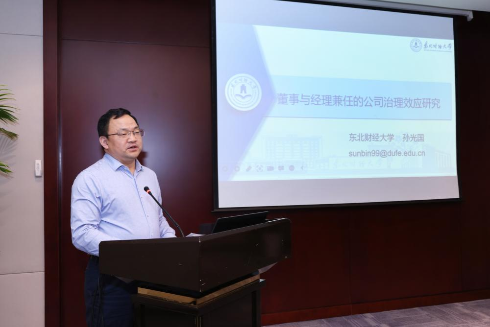 孙光国教授作《董事与经理兼任的公司治理效应研究》的报告。他介绍了董事与经理兼任的界定,从权责分析、政策背景、现实背景等方面对问题进行分析,以委托代理理论、现代管家理论、资本依赖理论为基础,详细阐释了相关研究成果。