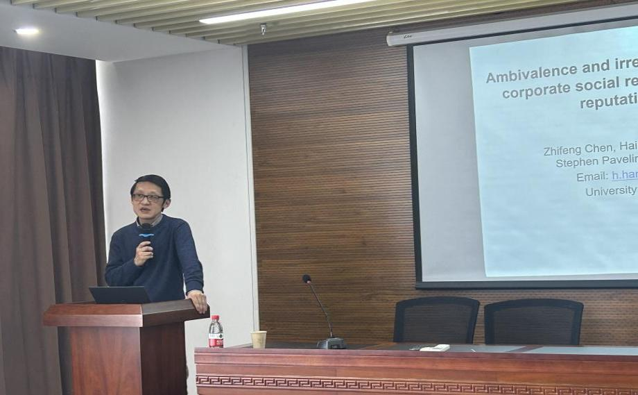 4月1日上午,英国巴斯大学市场营销系主任杭海明教授,应邀为Av大平台带来一场主题为《ambivalence and risk management of CSR》的专家报告。本次活动由Av大平台 副院长彭澎副教授主持,学院近百位师生参与。