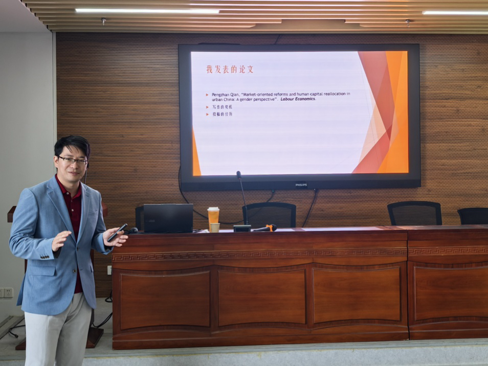 在报告阶段,钱鹏展博士结合自身从化学转向经济学的跨学科求学经历,系统分享了在英国进行科研成长的实践体会。他重点介绍了自己独作发表于Labour Economics的论文《Market-oriented reforms and human capital reallocation in urban China: A gender perspective》的写作契机与投稿经历,并分享了担任Economic Modelling、Eurasian Business Review等国际期刊审稿人的心得体会。钱博士还结合自己成功申请学校RA基金、Leverhulme青年研究员基金及盖茨基金会独立项目的经验,详细讲解了英国科研基金申请的流程与要点。此外,他分享了参加IZA Summer School、Econometrics Society、European Economic Association等国际学术会议的心得,并推荐了其个人整理的会议信息平台,鼓励师生积极参与国际学术交流。